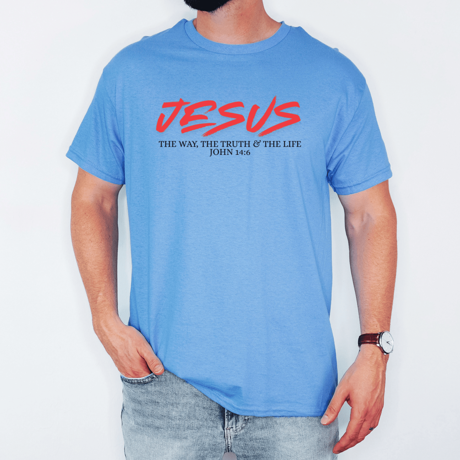 This shirt serves as a constant reminder of the profound spiritual truth that Jesus offers a direct relationship with God and leads to everlasting life. Crafted from soft, breathable cotton, it's perfect for everyday wear, Bible study, or casual outings where you want to openly share your faith.